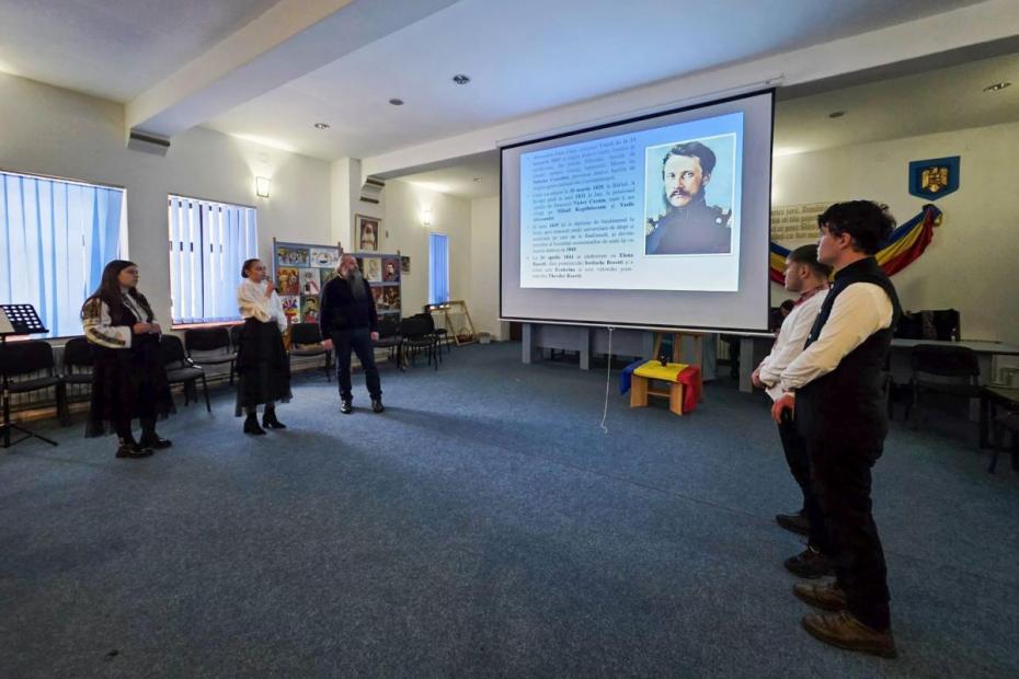 Programul a continuat cu interpretarea unui cântec patriotic de către elevii clasei a IX-a Patrimoniu Cultural, urmată de prezentarea istorică a drumului anevoios spre Unire, a personalităților politice care au făcut posibilă aceasta și a legendarului Moș Ion Roată, susținută de elevii Adriana Juravle, Irina Voineag, Ambrozie Gârleanu, Alin Doru Solcan și Pâslariu Cristi.